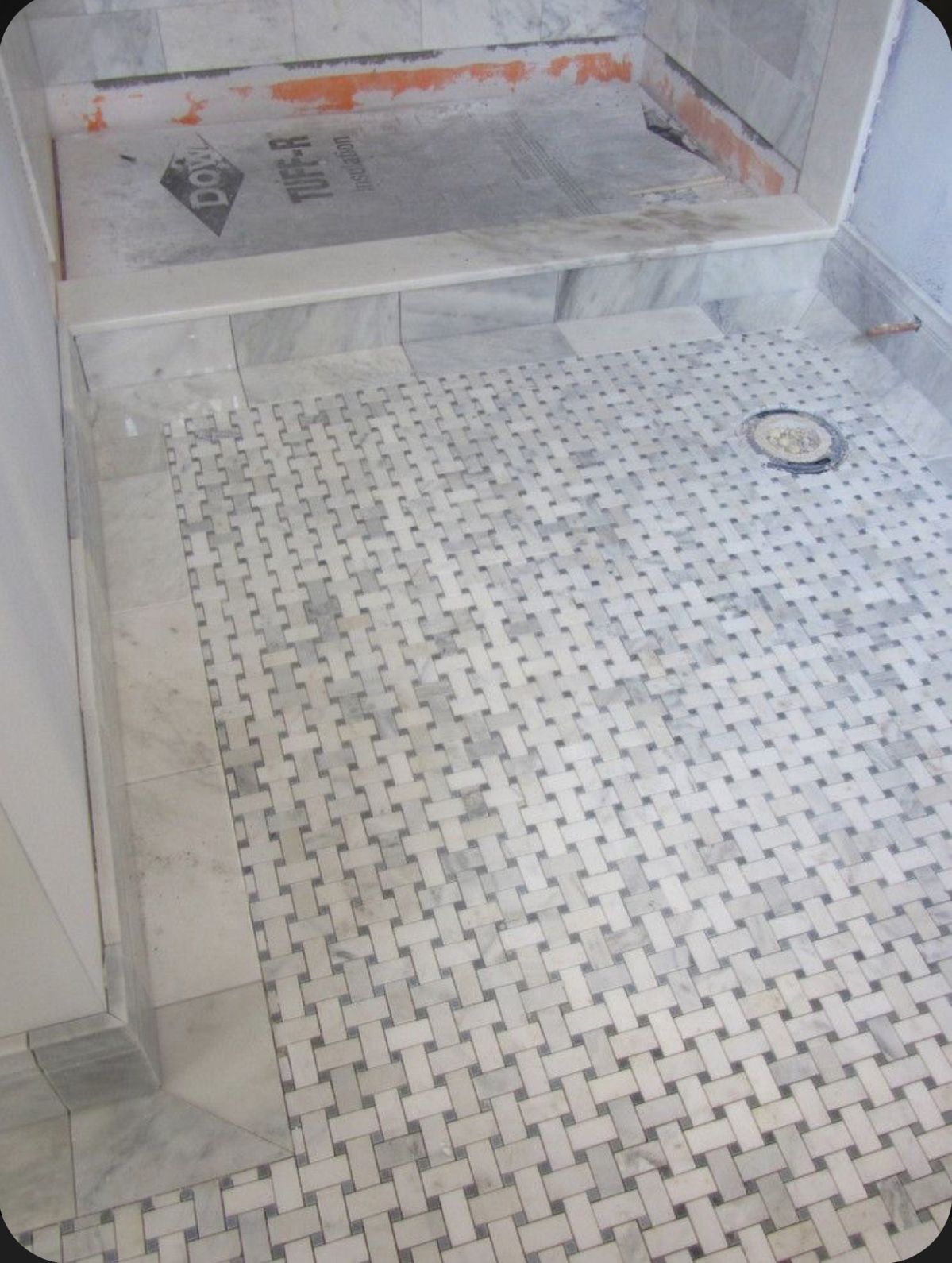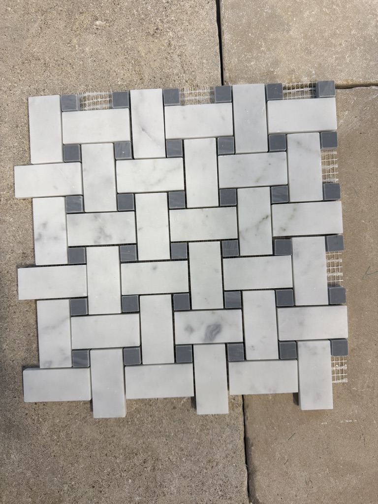 Basket Weave Mosaikk i italiensk Carrara- og Bardiglio-marmor. Et klassisk valg til baderom. Kommer ferdig på nett i 30,6×30,6.