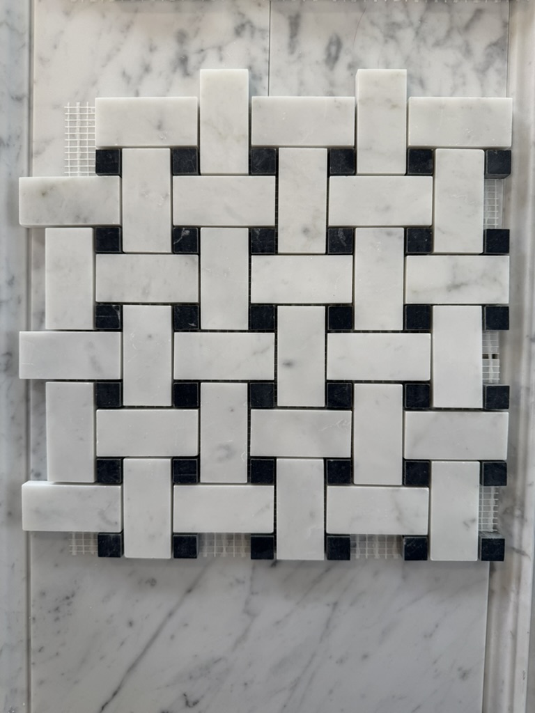 Basket Weave Mosaikk i ekte italiensk Carrara- og Nero Marquina-marmor i den fineste kvaliteten.