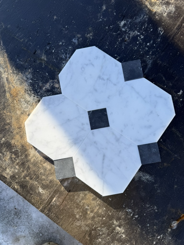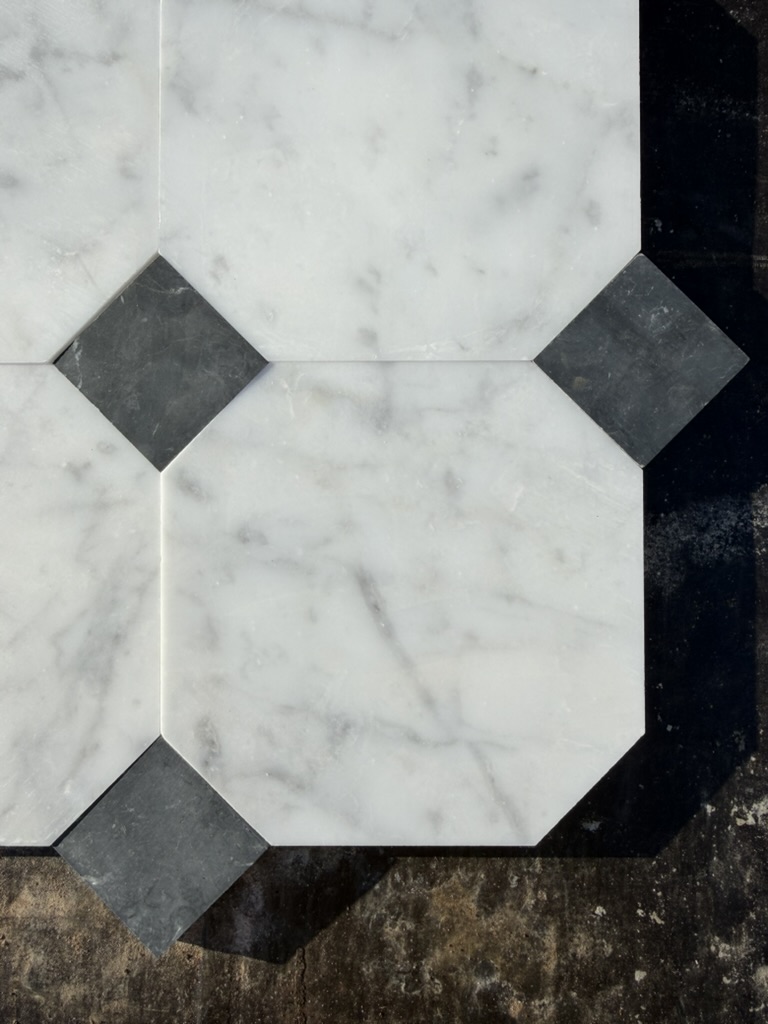 Marmorfliser i klassisk italiensk oktagon-mønster med silkematt overflate. Hvit Carrara i fineste C-kvalitet kombineres med små tosetter av sort Nero Marquina marmor.