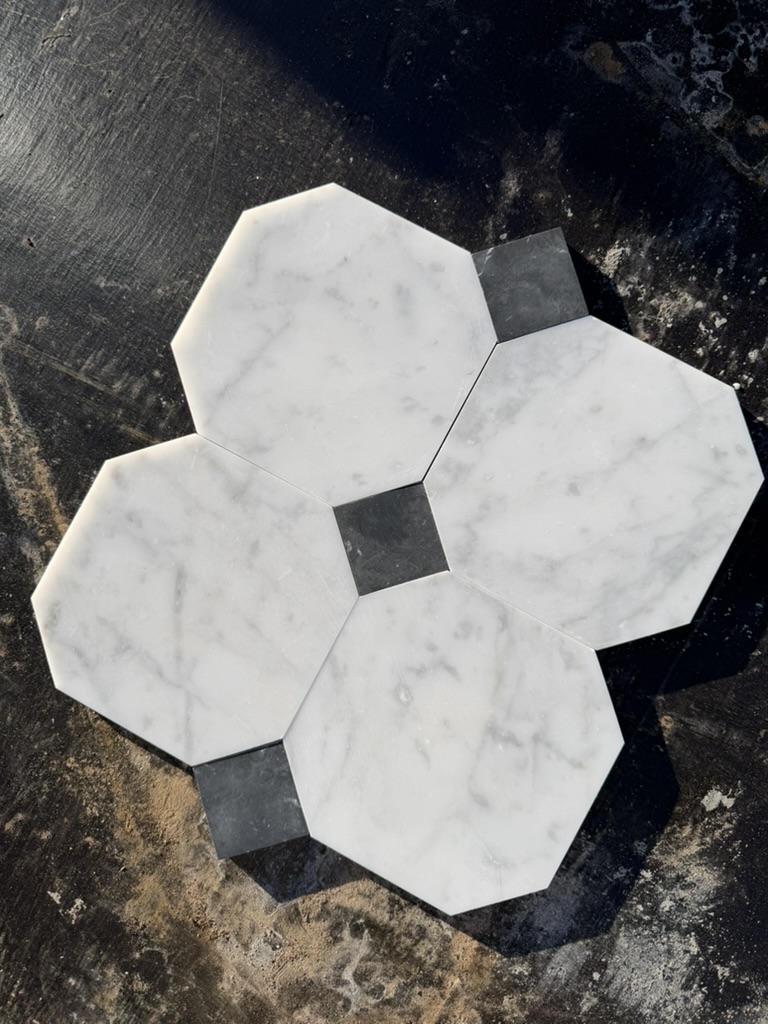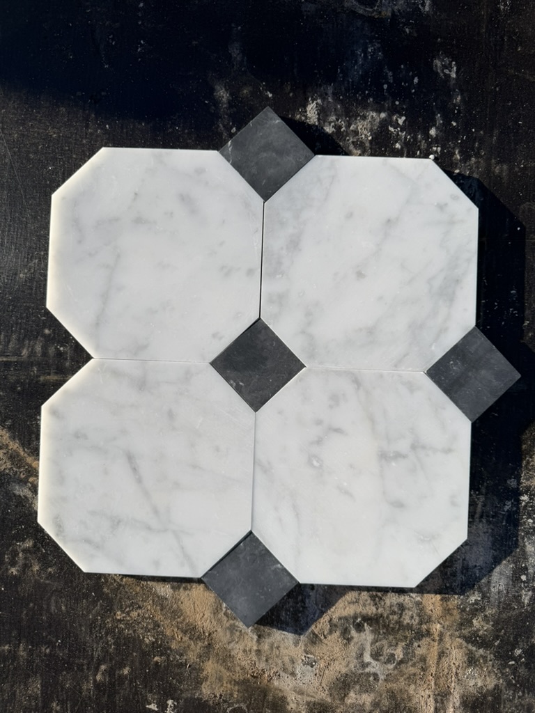 Marmorfliser i klassisk, italienske oktagon-mønsteret med silkematt overflate. Hvit Carrara-marmor i den fineste C-sorteringen kombineres med små tosetter i eksklusiv sort Nero Marquina. Carrara C er kjent for sin lyse, rene bunnfarge og elegante grå årer, og regnes som den mest ettertraktede sorteringen av Carrara-marmor fra bruddene i Toscana.