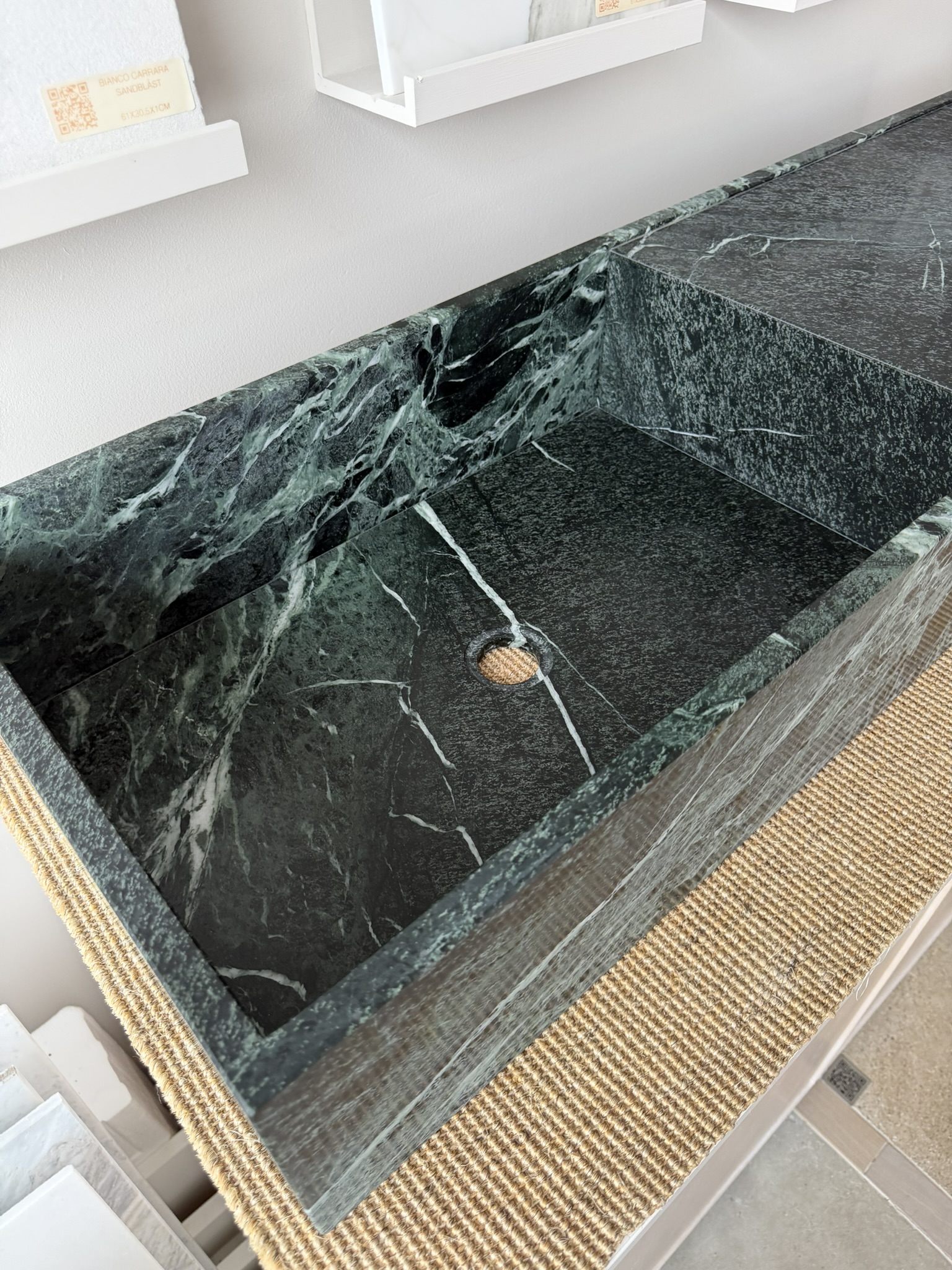 Stenvask i eksklusiv Verde Alpi-marmor fra de italienske Alpene, håndlaget i vår lokale familieproduksjon på Fossum i Bærum.