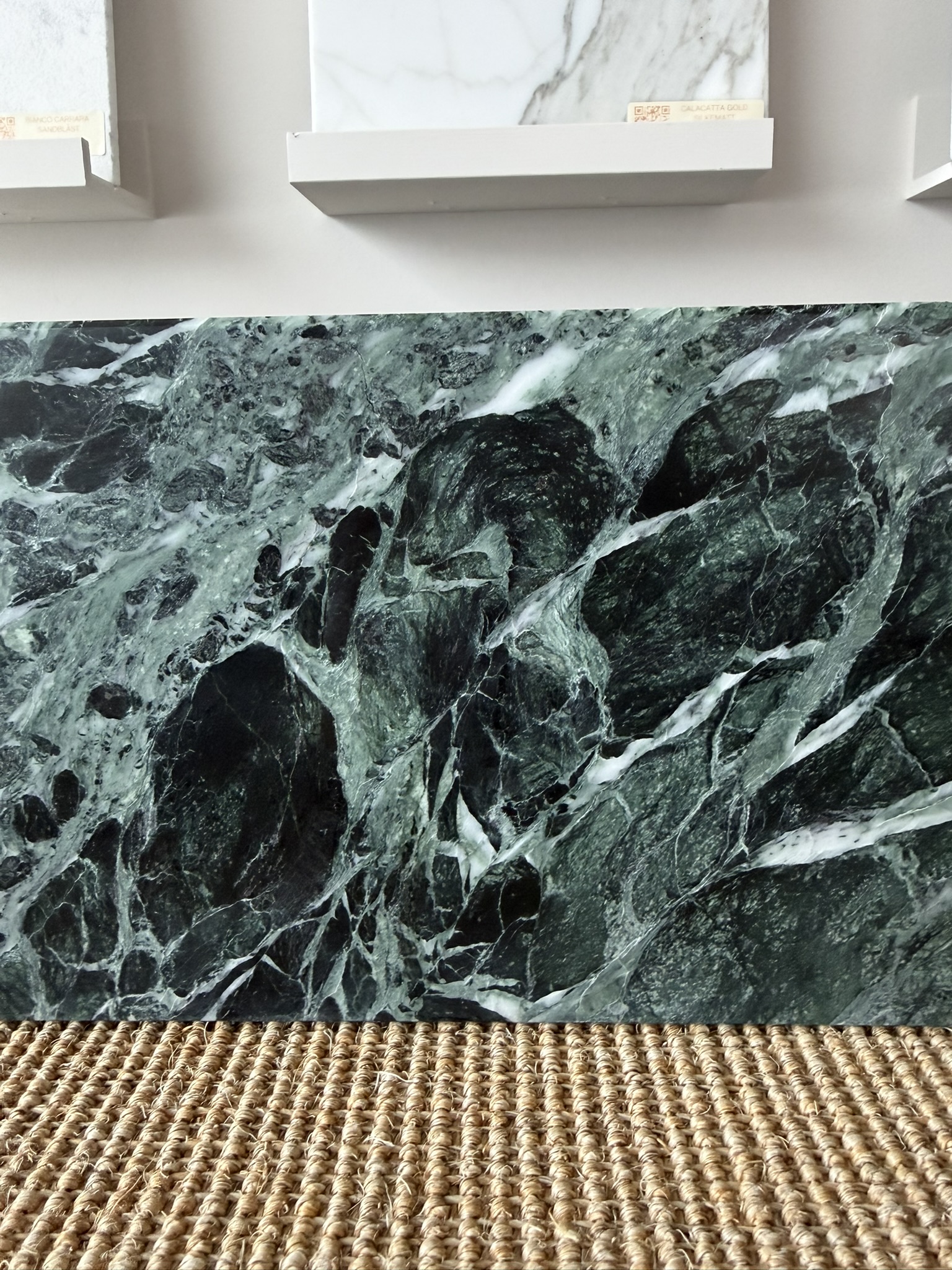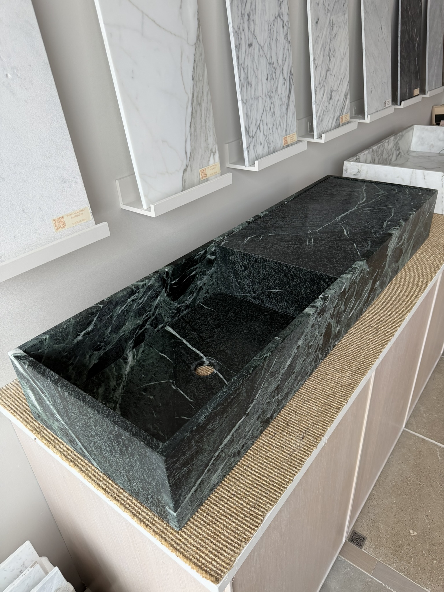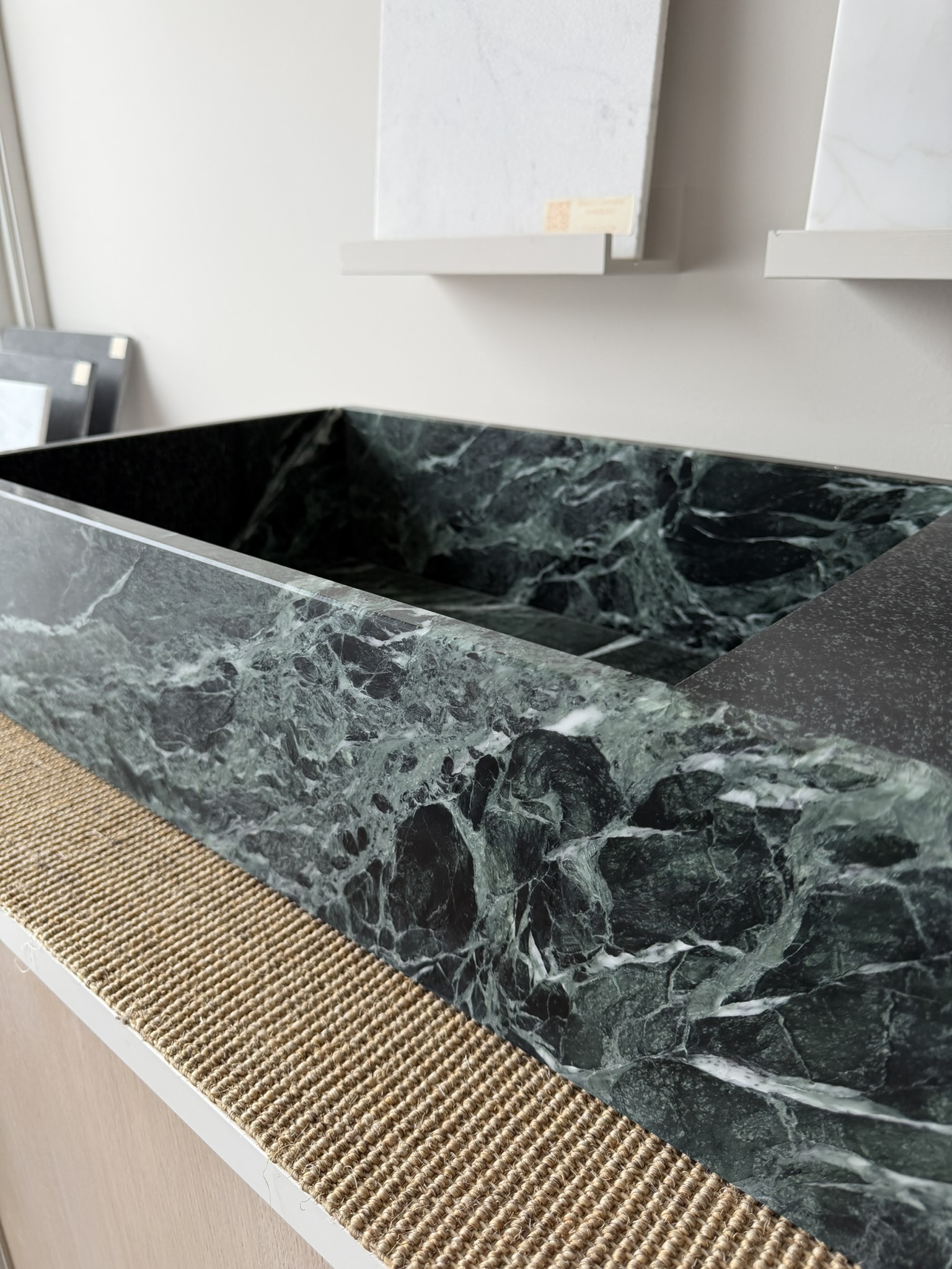 Servanten er skåret ut av en dypt grønn marmortype som brytes i fjellområdene i de italienske Alpene. Stenen er dannet under ekstremt trykk og temperatur i fjellkjeden, noe som gir det karakteristiske dramatiske fargespillet i smaragdgrønt, sort og hvitt – rikere og mer mineralpreget enn klassisk Carrara-marmor fra Toscana.